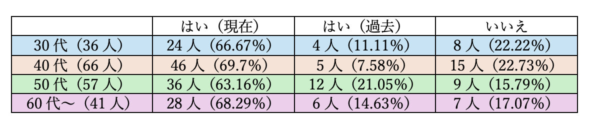 年代別では、現在セックスレスだと感じている人は60代以降の人がもっとも多く、過去セックスレスを経験した人は50代が多い結果となりました。