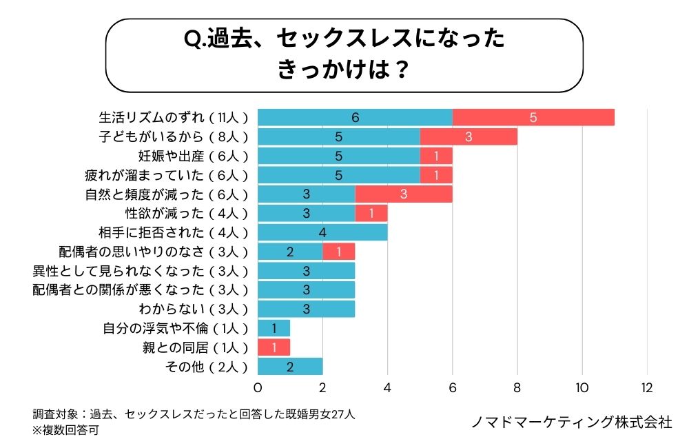 過去、セックスレスを経験したことがあると回答した既婚男女27人(男性20人・女性7人)に対し、なぜセックスレスになったのかを聞きました。