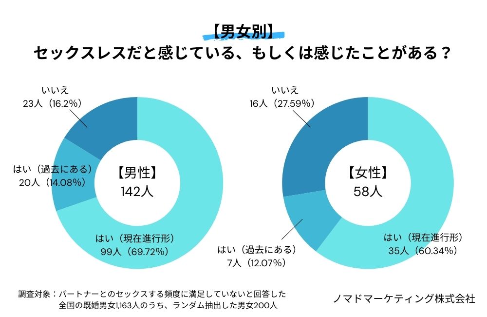 パートナーとのセックスする頻度に「満足していない」と回答した既婚男女1,163人(男性802人・女性361人)のうち、ランダム抽出した男女200人(男性142人・女性58人)にアンケート。