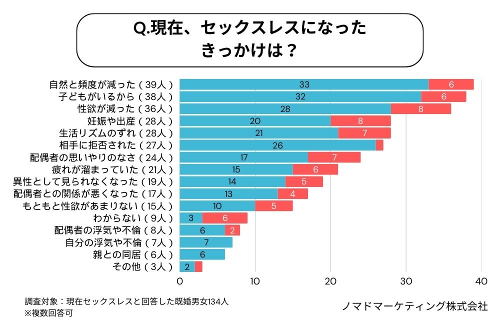 最後に、「現在セックスレス」と回答した既婚男女134人に向けて、なぜセックスレスになったのかを聞きました。