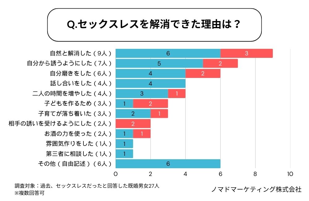 過去セックスレスを経験した既婚男女27人に、現在はセックスレスを解消できているのはなぜなのかを聞きました。