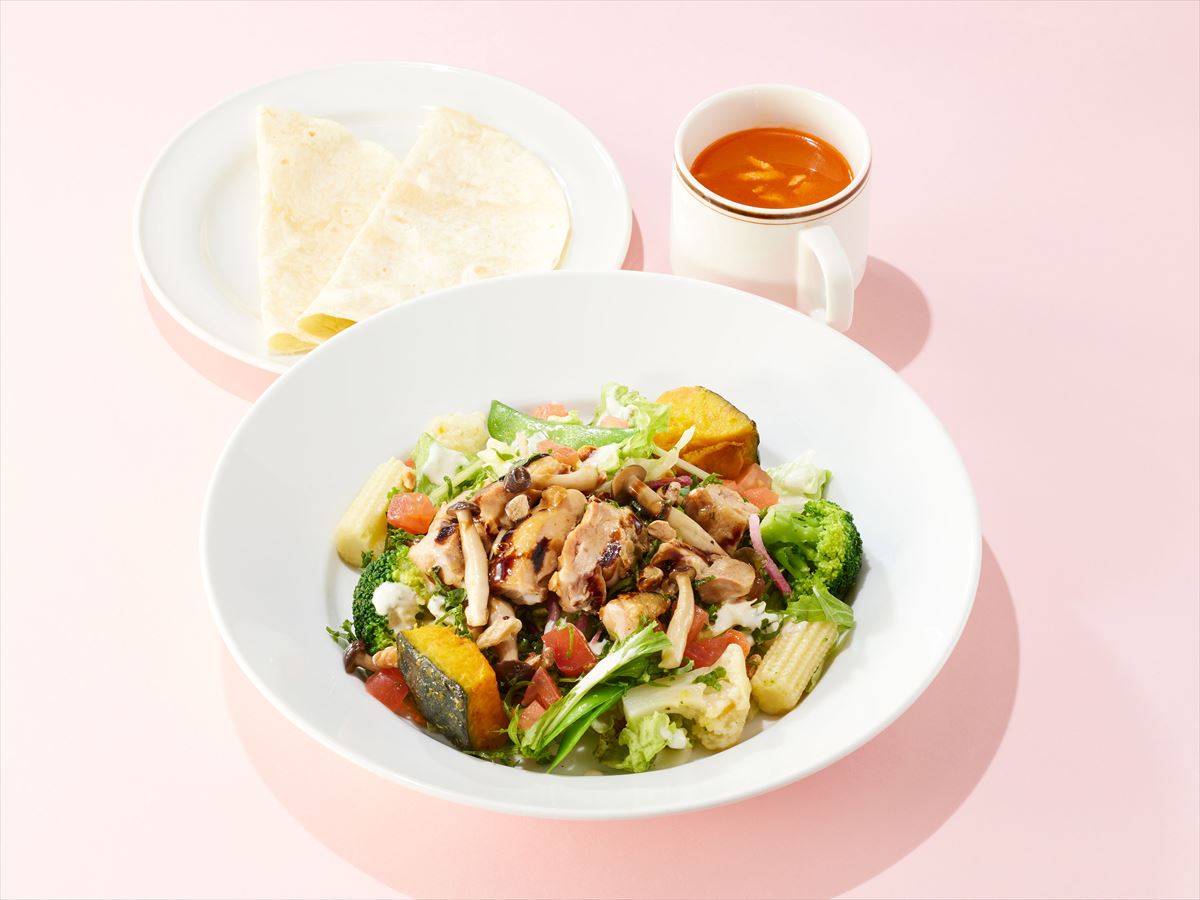 大ぶりにカットしたチキンやたっぷりの野菜、ナッツを盛り付けたサラダは食べ応え抜群です。芳醇な香りと甘酸っぱい味わいのバルサミコソースが、スナップエンドウ、ヤングコーンなどの野菜や、しめじ、チキンとマッチします。クルミやアーモンドのカリッとした食感のアクセントも楽しいサラダです。