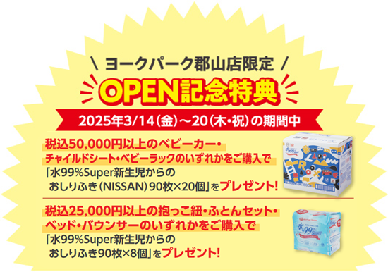 さらに期間中、税込50,000円以上のベビーカー・チャイルドシート・ベビーラックのいずれかをご購入で、「水99%Super 新生児からのおしりふき(NISSAN)90枚×20個」を、税込25,000円以上の抱っこ紐・ふとんセット・ベッド・バウンサーのいずれかをご購入で「水99%Super 新生児からのおしりふき 90枚×8個」をプレゼントいたします。