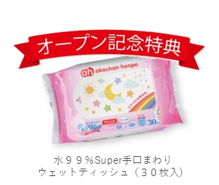オープン記念特典として、セール期間中お買上げいただいた方に「水99%Super 手口まわりウェットティッシュ(30枚入)」をプレゼントいたします。(各日先着200名様限定 ※1家族様1点限り)