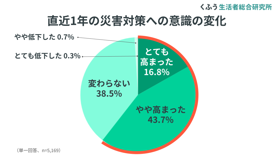 災害対策への意識について、直近1年で「やや高まった」(43.7%)と回答した人が最も多く、「とても高まった」(16.8%)と合わせた約6割が「災害対策への意識が高まった」と感じていることがわかりました。