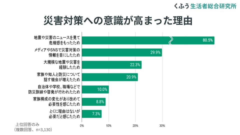 災害対策への意識が高まった理由は「地震や災害のニュースを見て危機感をもったため」(80.5%)という回答が圧倒的に多い結果となりました。「メディアやSNSで災害対策の情報を目にしたため」(29.9%)、「大規模な地震や災害を経験したため」(22.3%)と続き、被災経験や災害に関する情報による意識の高まりもあることがわかります。「家族や知人と防災について話す機会が増えたため」(20.9%)という回答もあり、災害への備えが生活者の身近な話題となっていることもうかがえます。