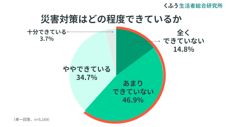 一方、防災用品の準備や食料品の備蓄などの災害対策については、「あまりできていない」(46.9%)、「全くできていない」(14.8%)を合わせた6割以上が「できていない」と回答しました。