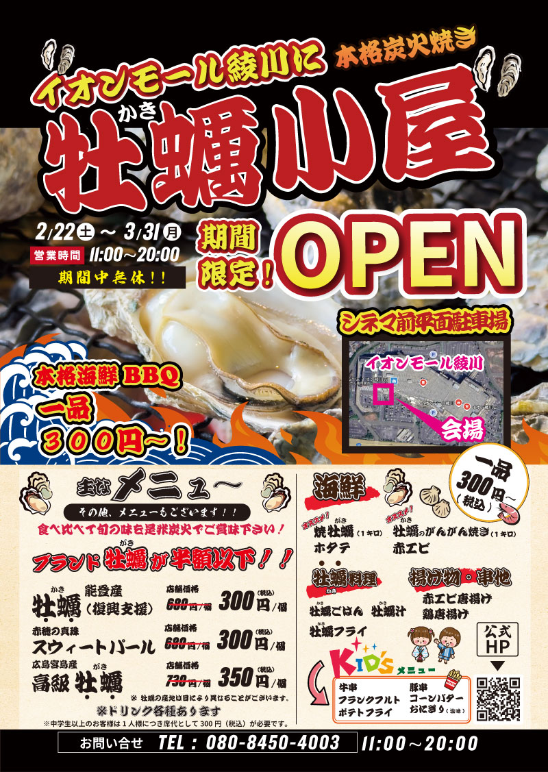 弊社はバーベキューのケータリング事業と海鮮居酒屋を営んでおります。これらの事業でのノウハウを活かし、新鮮な美味い牡蠣を炭火焼きで。さらに現地価格で楽しんでもらいたいと思い、大阪にて期間限定開催致しました。大変ご好評の声を頂き、気軽に香川県の皆様に楽しんで頂きたいと思い、イオンモール綾川にて期間限定開催する運びとなりました。冬の味覚を是非ご家族で、馴染みのある場所で味わっていただきたいと思っております。