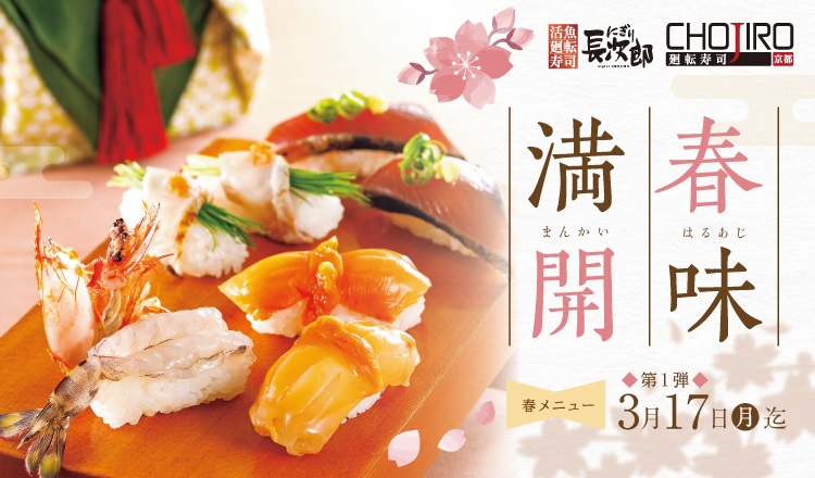 株式会社フーズネット(本社・⼤阪府⼤阪市、代表取締役社⻑・加藤誠)が運営する「活⿂廻転寿司にぎり⻑次郎」 「廻転寿司CHOJIRO京都」は、2025年2月18日(火)から2025年3月17日(月)まで、春メニュー第1弾を販売いたします。第1弾では、「春味満開(はるあじまんかい)」と題して「ふぐ」や「活車海老」など、期間限定のネタを入荷いたします。期間中『春の感謝祭』を同時開催いたします。この季節ならではの味わいを、心ゆくまでお楽しみください。