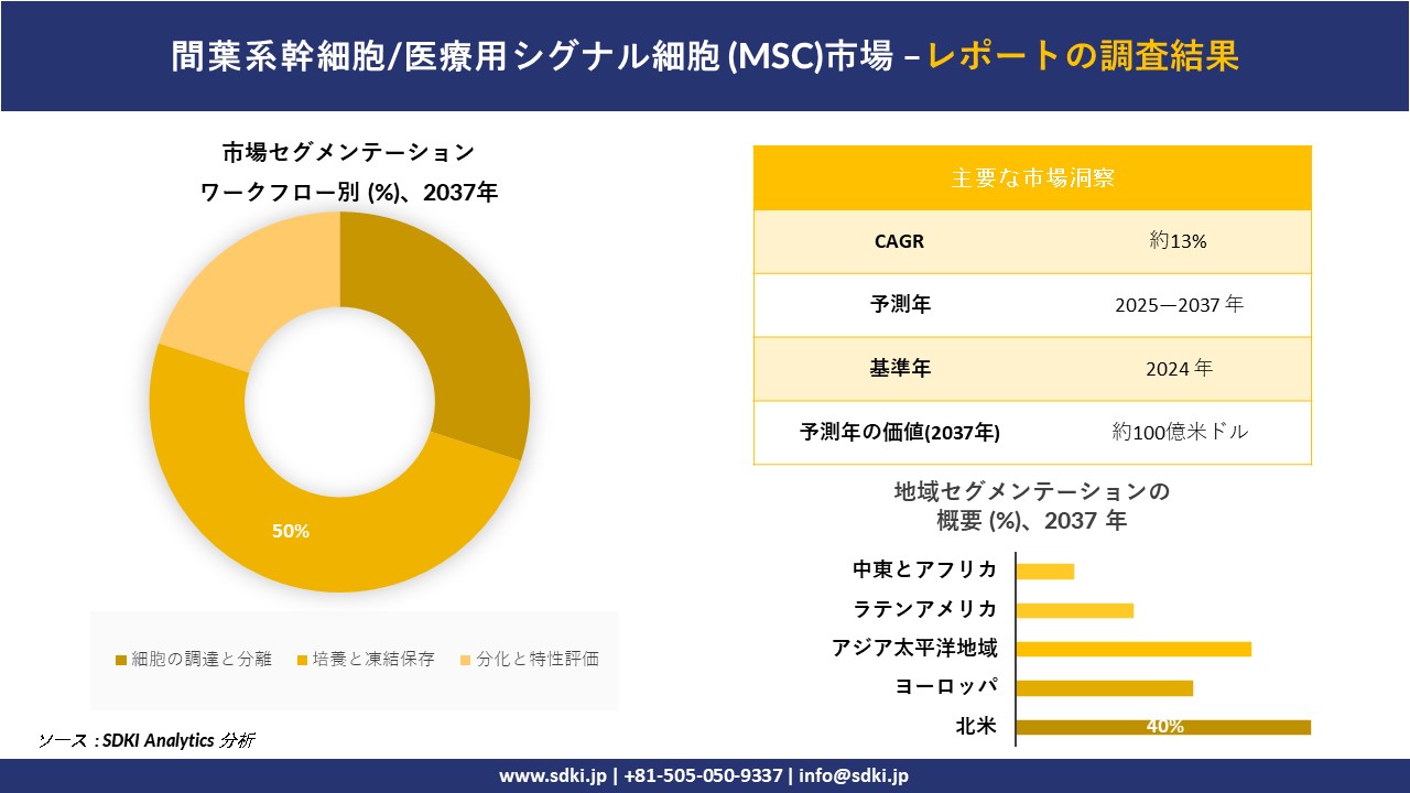 SDKI Analyticsのアナリストによると、間葉系幹細胞/医療用シグナル細胞 (MSC) 市場規模は2024年に約30億米ドルと評価されており、この市場は予測期間中に約13%のCAGRで成長し、2037年までに約100億米ドルに達すると予測されています。当社のアナリストは、パーソナライズ医療と精密医療の需要の高まりが MSC 市場を後押ししていることを発見しました。治療が個々の患者のプロファイルに合わせて調整されるパーソナライズ医療への傾向が高まるにつれて、自己 MSC 療法が大幅に増加しています。