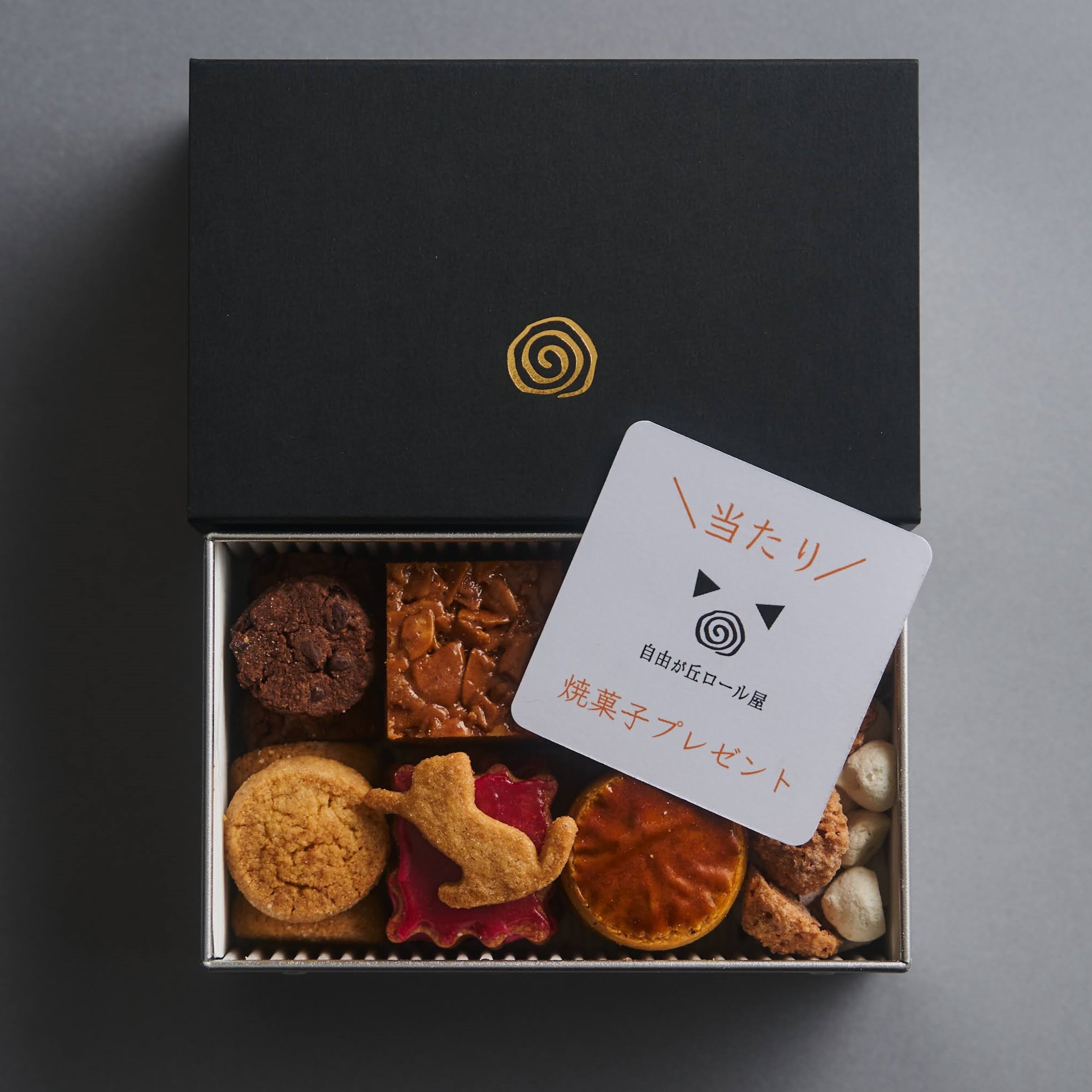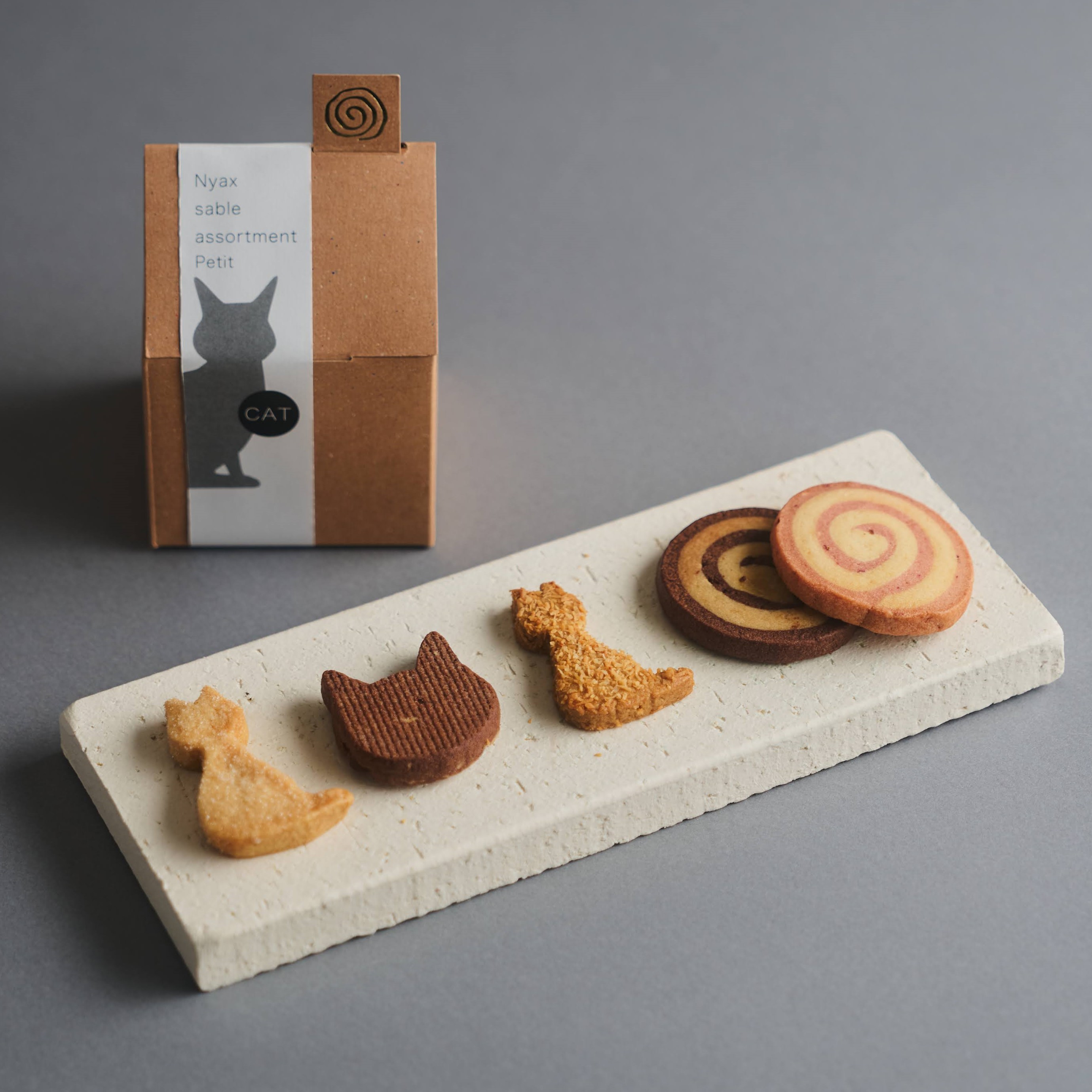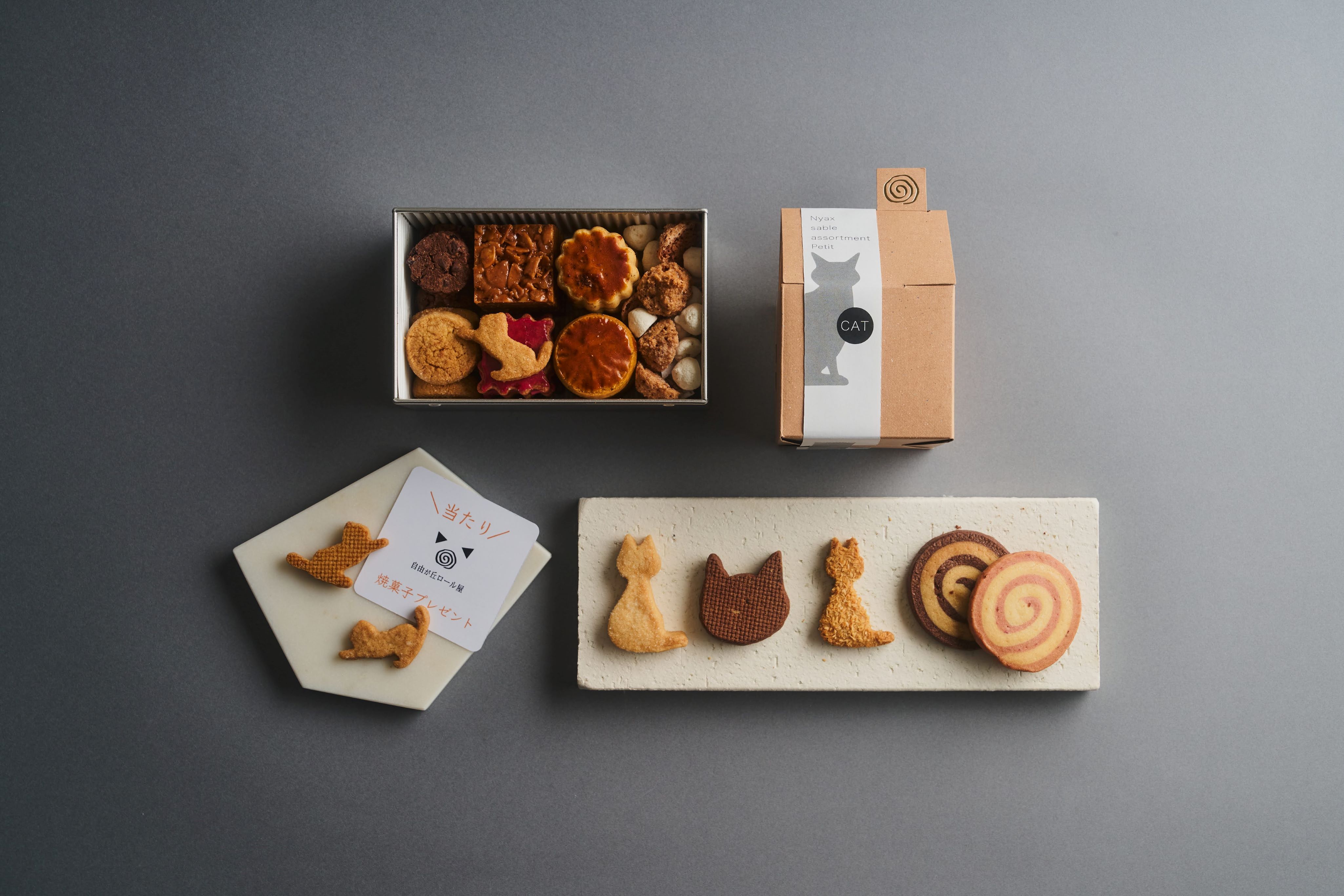 猫の形をしたネコサブレを忍ばせたロールケーキとアソート