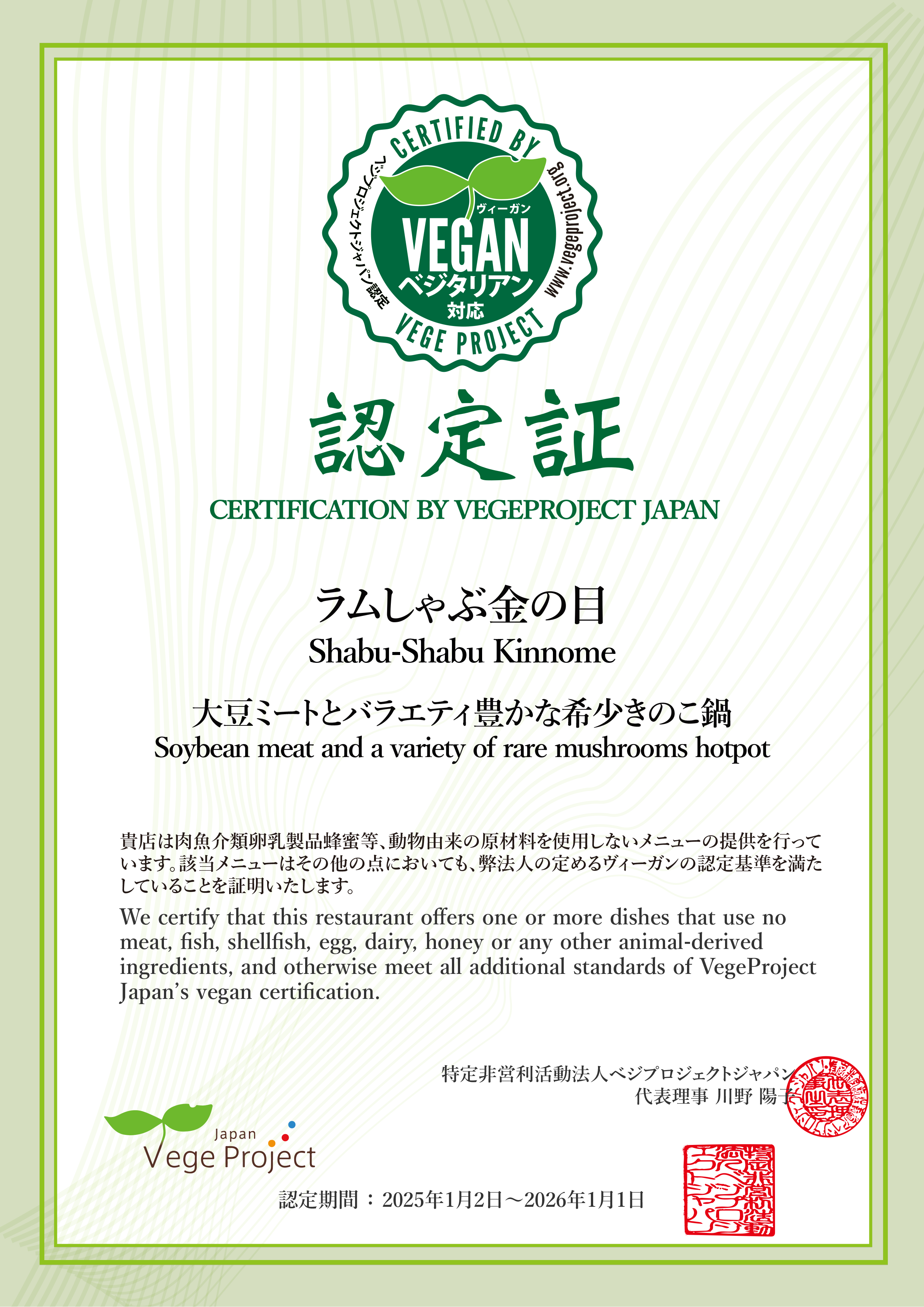 『ラムしゃぶ金の目』のヴィーガンメニューがヴィーガン認証を取得!