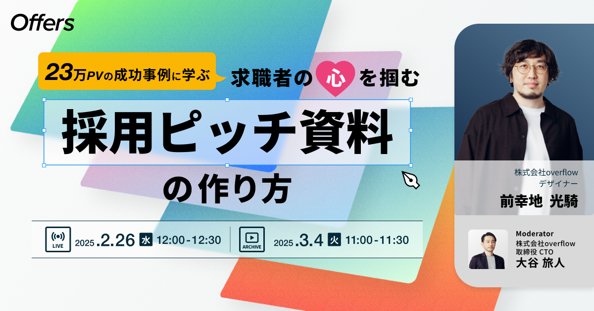 本セミナーでは、23万PVを達成したoverflowの採用ピッチ資料を作成したデザイナー・前幸地が、成功要因や具体的ノウハウを徹底解説。採用ピッチ資料作成で押さえるべきポイントや、すぐに実践できるアプローチをわかりやすくお伝えします。ぜひご参加ください。