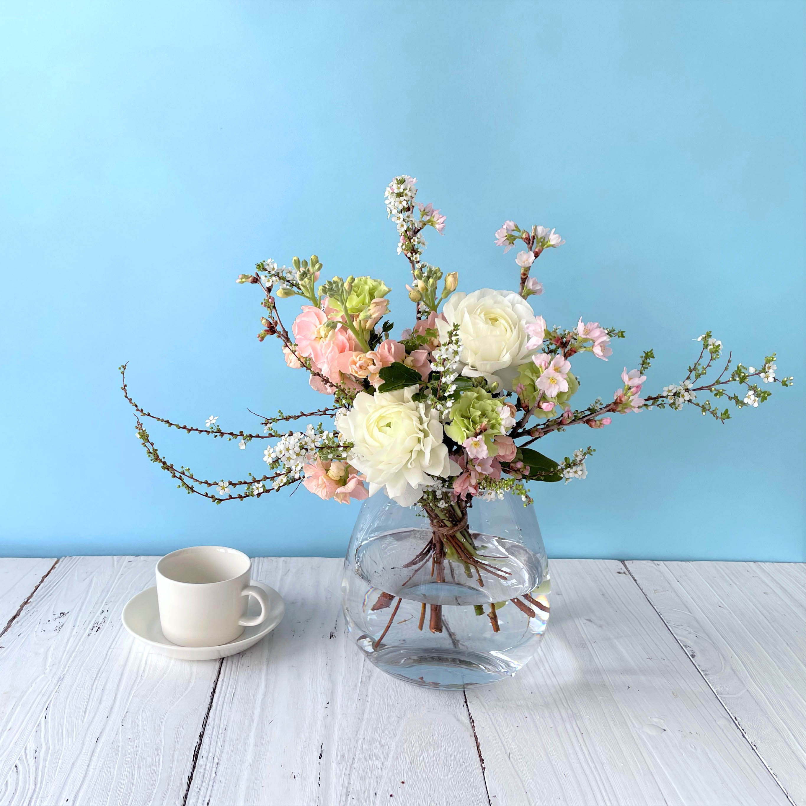桜と季節の小花を合わせ春らしいアレンジメントに仕上げました。器付きでそのまま飾って楽しめます。