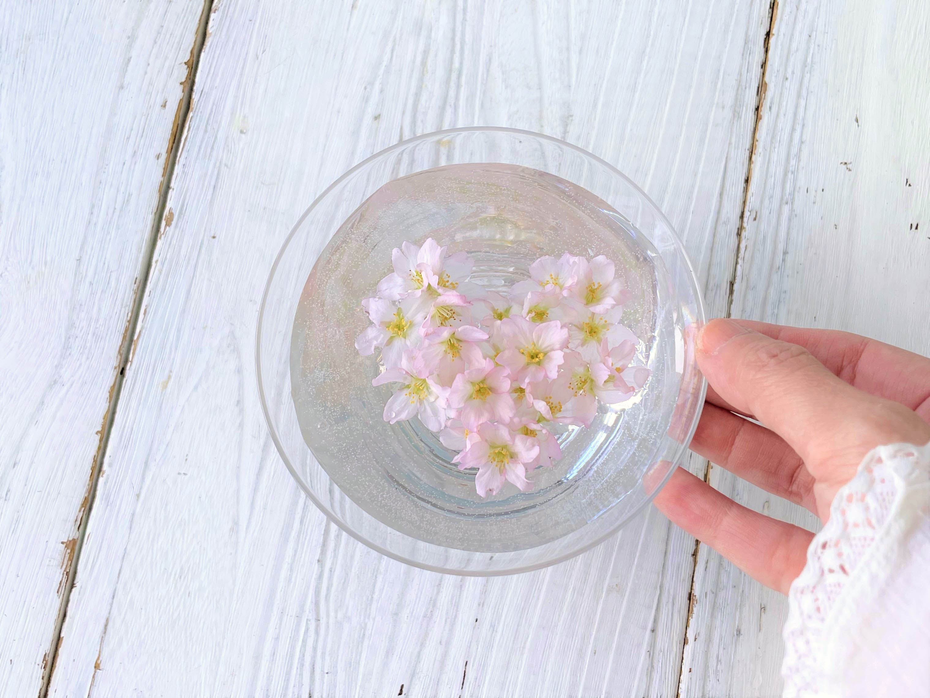 水の上に桜の花をハートのかたちに浮かべました。透明なセロファンにハート型の切り込みを入れて花を浮かべるとハート型がキープできます。