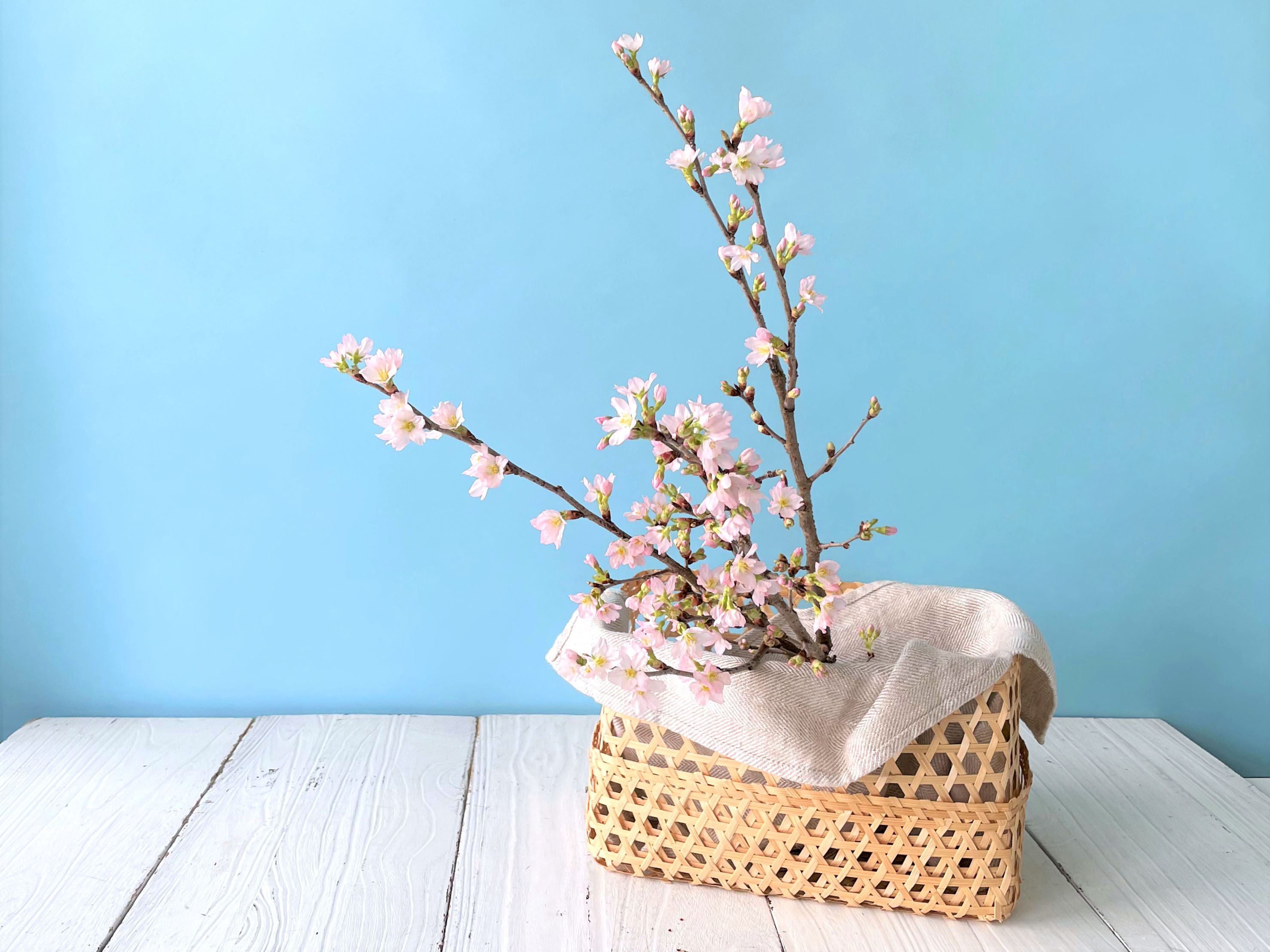 竹かごに布を敷いてコップなどに入れた桜をざっくりといけた、ちょっぴり和風の花あしらいです。