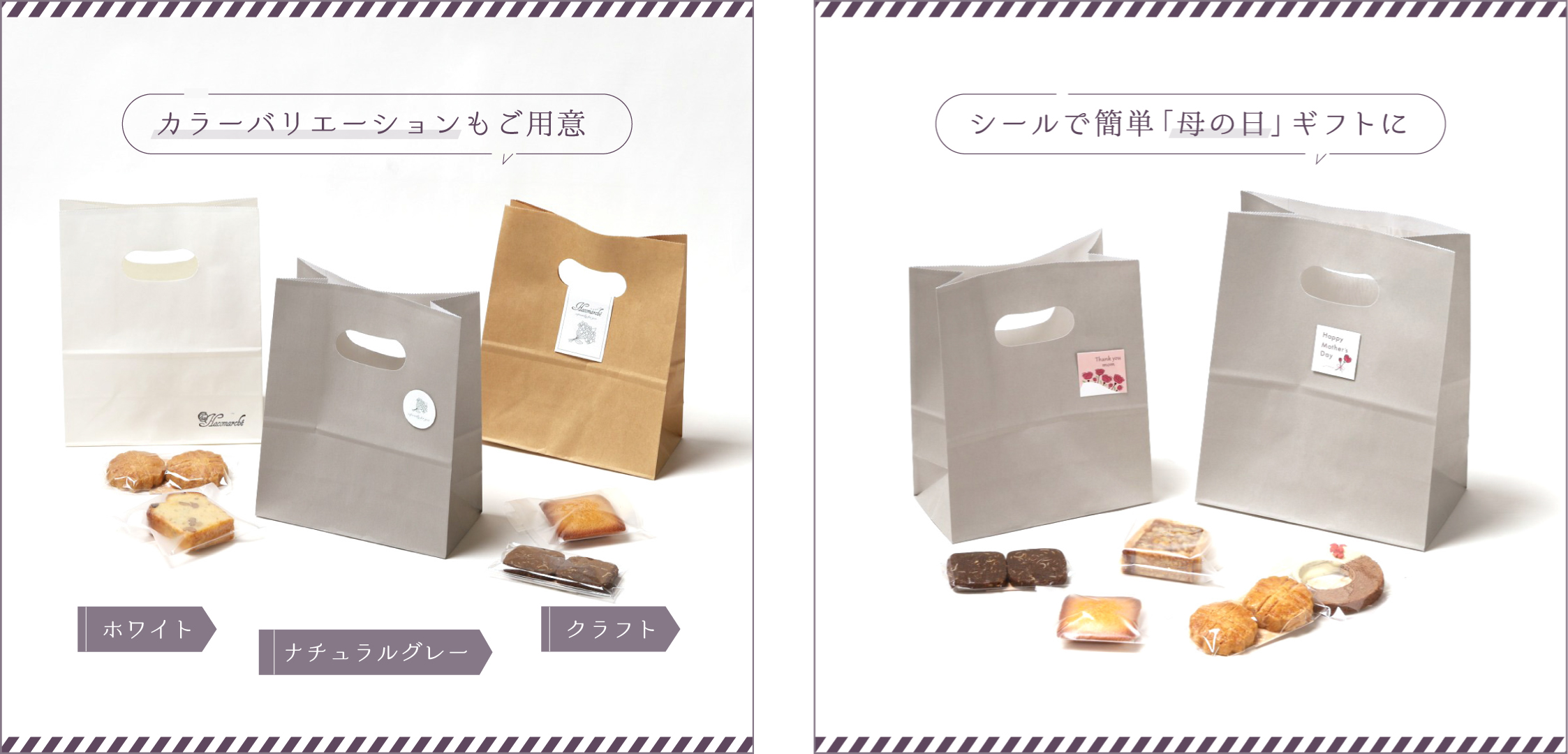 お持ち帰り用の紙袋で安価なイーグリップシリーズに、ハコマルシェでの人気カラー「ナチュラルグレー」が新登場。焼き菓子や雑貨などのお持ち帰りにぴったりなS/Mサイズです。