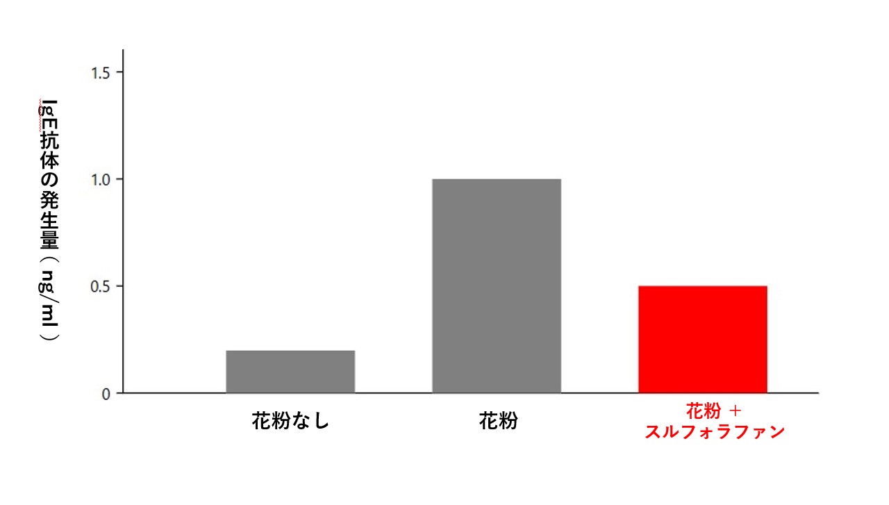 筑波大学の⾕中昭典⽒(東京理科大学:当時)らの研究では、ブロッコリースプラウトに含まれる「スルフォラファン」に、花粉症を抑える効果があることが、マウスを用いた実験で確認されています。スルフォラファンには、体の中での過剰な反応を抑える力があり、IgE 抗体の数を増やしすぎないようにしてくれます。数が適切に保たれることで、花粉に対する過剰な反応が減り、結果としてくしゃみや鼻水などの症状も出にくくなることがわかりました。※「スルフォラファンによるスギ花粉症の制御に関するトランスレーショナルリサーチ」(2013)