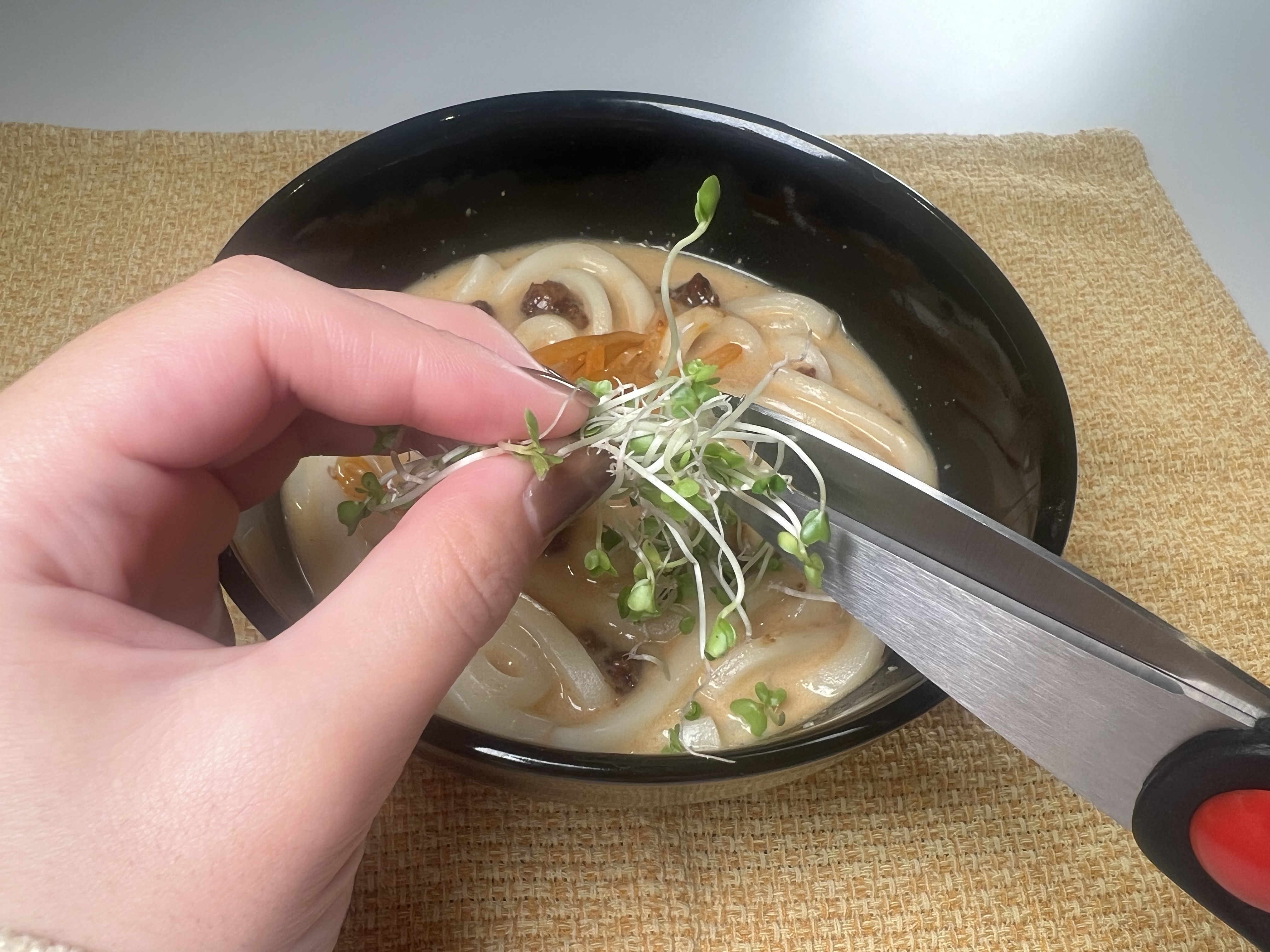 発芽3日目のブロッコリースーパースプラウトは水洗い不要。パックから取り出してすぐに調理できます。しかし、スルフォラファンは常温で蒸発しやすい性質なため、刻んでの作り置きはオススメできません。キッチンバサミを使えば、⾷べる直前に⾷べる分だけ手軽に刻むことができます。
