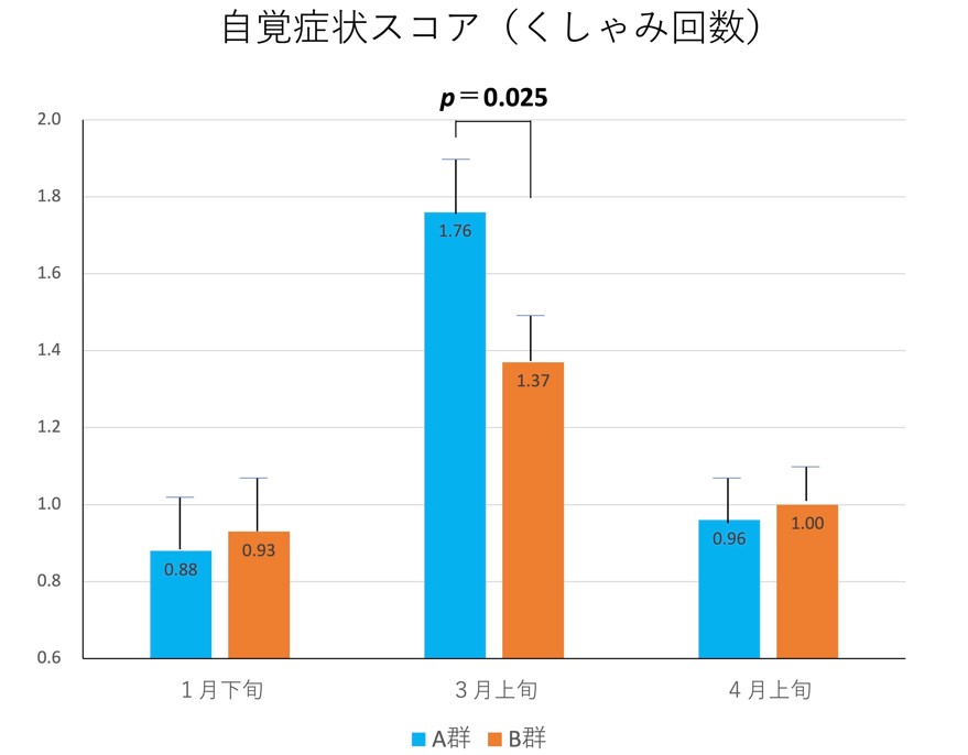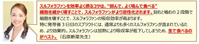 筑波大学 医学医療系、つくば機能性⾷品予防医学研究所の⾕中昭典⽒の研究によると、花粉大量飛散期にブロッコリースプラウトを 1日50g(朝 25g、⼣25g)摂取したグループでは、花粉大量飛散期におけるくしゃみ回数の有意な減少効果が認められました。
