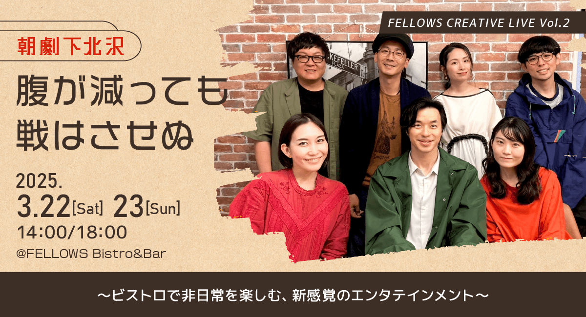 クリエイター専門の人材マネジメント(紹介・派遣)を行う株式会社フェローズは新感覚エンタテインメント「FELLOWS CREATIVE LIVE」第2弾として、「朝劇下北沢」による『腹が減っても戦はさせぬ』を2025年3月22日(土)・23日(日)に、FELLOWS Bistro&Bar(恵比寿)にて公演いたします。