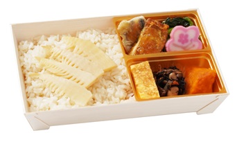 筍をのせただし炊き込みご飯に、鰆のおろしだし餡かけや菜の花のからし和えなどだしを利かせたおかずを詰め合わせた春限定のお弁当です。