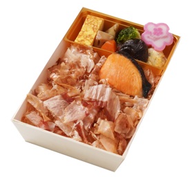 だし炊き込みご飯の上に本枯鰹節をたっぷりとのせたお弁当です。鮭だし漬焼きやだし焼き玉子、和風ぽてとサラダなど人気のおかずを詰め合わせました。