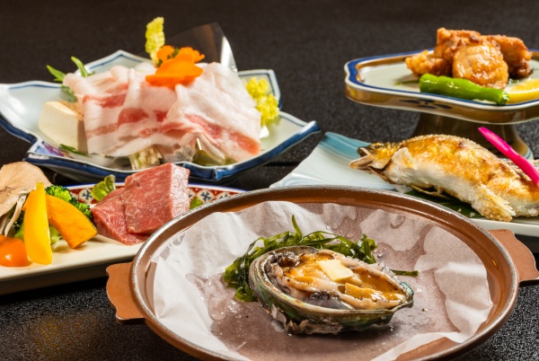 「雫石牛ステーキ」「とらふぐ唐揚」「白金豚のしゃぶしゃぶ」「鮎の塩焼き」「あわび陶板焼」の中から、お好きなメイン料理を組み合わせてお楽しみください。