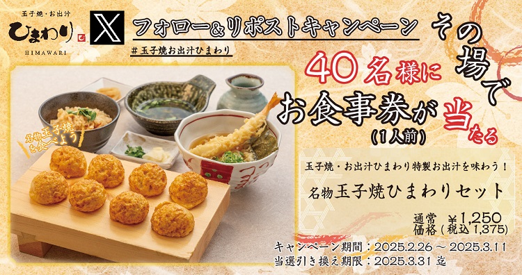 この度、玉子焼・お出汁ひまわり公式Xアカウントとフォロー&リポストして応募すると、抽選で40名様に「名物玉子焼ひまわりセット1人前(税込み1,375円)」をお召し上がりいただけるデジタルお食事券プレゼントキャンペーンを2025年2月26日(水)より開催します。この機会にぜひご応募ください。