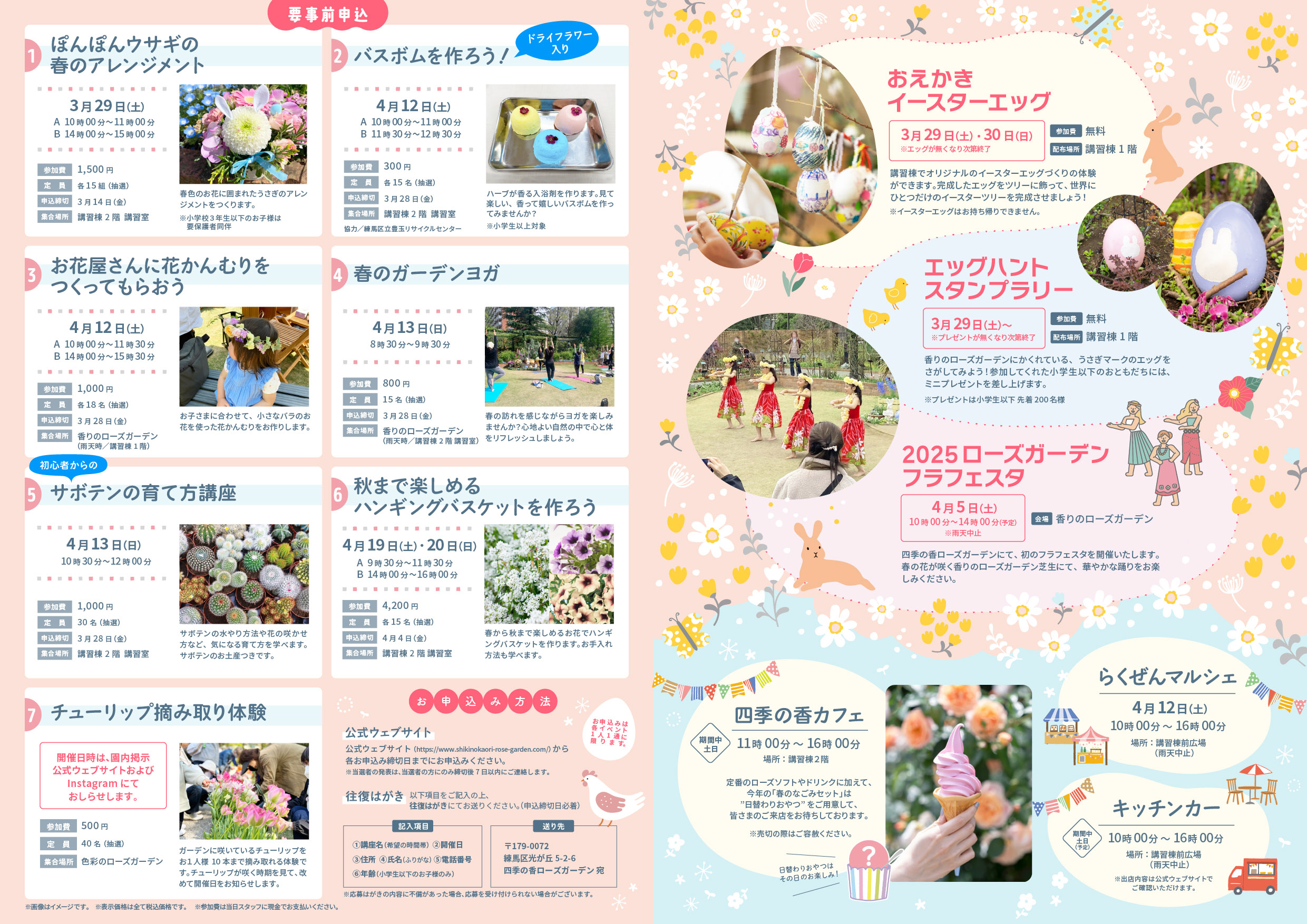 さらに第一園芸のガーデナーによるアレンジメント教室やお子様に合わせてミニバラの花かんむりを作る大人気のイベント、各ガーデンにはフォトスポットを設置し、さらに期間限定のペットと一緒に撮影できるミニフォトスポット(ガーデン外)も設置します。その他にも毎年大好評のチューリップの摘み取り体験を実施し、土日限定営業の四季の香カフェでは、本イベント初となる日替わりのスイーツなどがドリンクとセットになる「春のなごみセット」も販売します。駅にも近く入園無料ですので、お気軽にご家族やご友人とご来園ください。