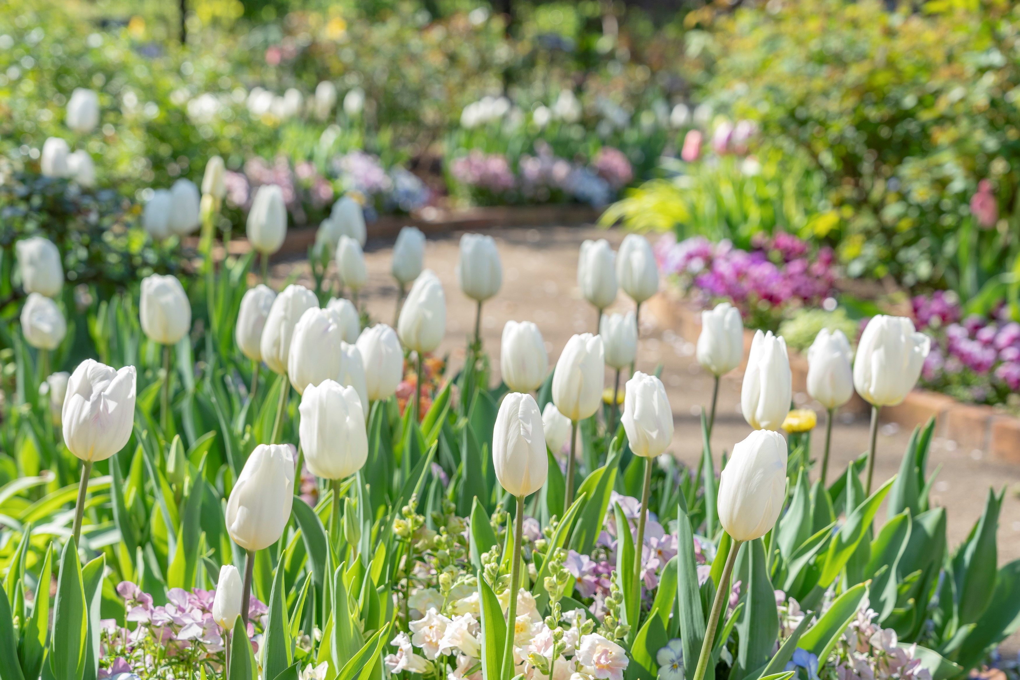 園内では、珍しい花型や咲き方、可愛らしいお花など1万本以上のチューリップが開花シーズンを迎えます。厳選した69品種のカラフルなチューリップが春の訪れをお祝いするように園内を彩ります。