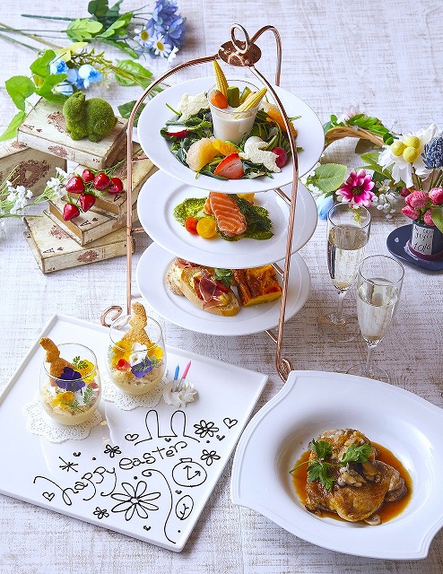 その後を追ったアリスが目にしたのは、美しく咲き誇るフラワースイーツ や 卵をモチーフにした可愛らしいお料理、そして春の味わいがずらりと並べられたティパーティー会場。