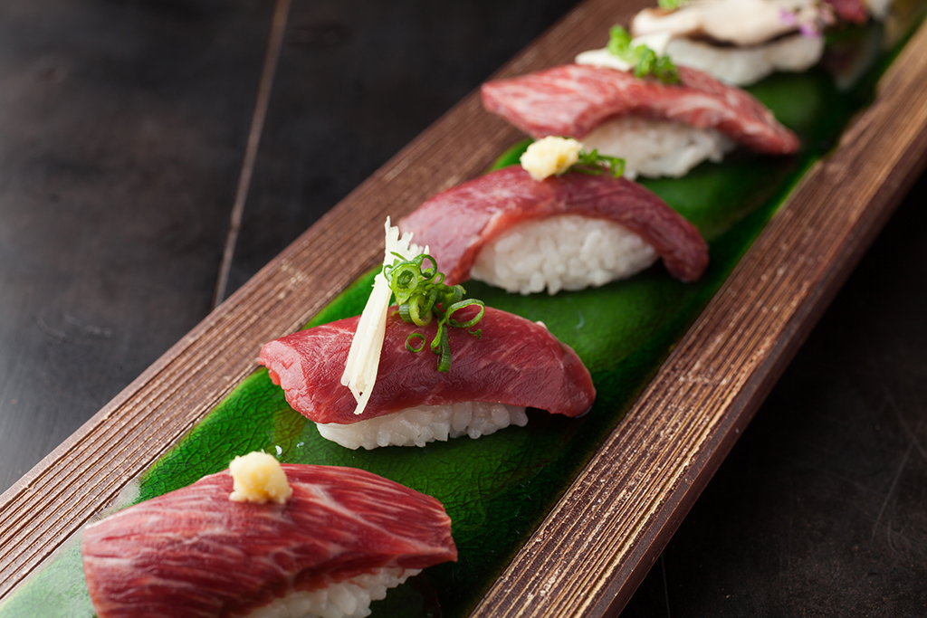 締めこそ、宴の余韻をじっくりと味わいたいもの。「刺し」メニューのラインナップを贅沢にネタに使った「握り」、鮮度の高い馬肉を敢えて叩いてネギや沢庵を混ぜ込んだ「巻物」や「軍艦」と、美味しい馬にこだわるがゆえに行き着いた、究極の〆は見逃せません。