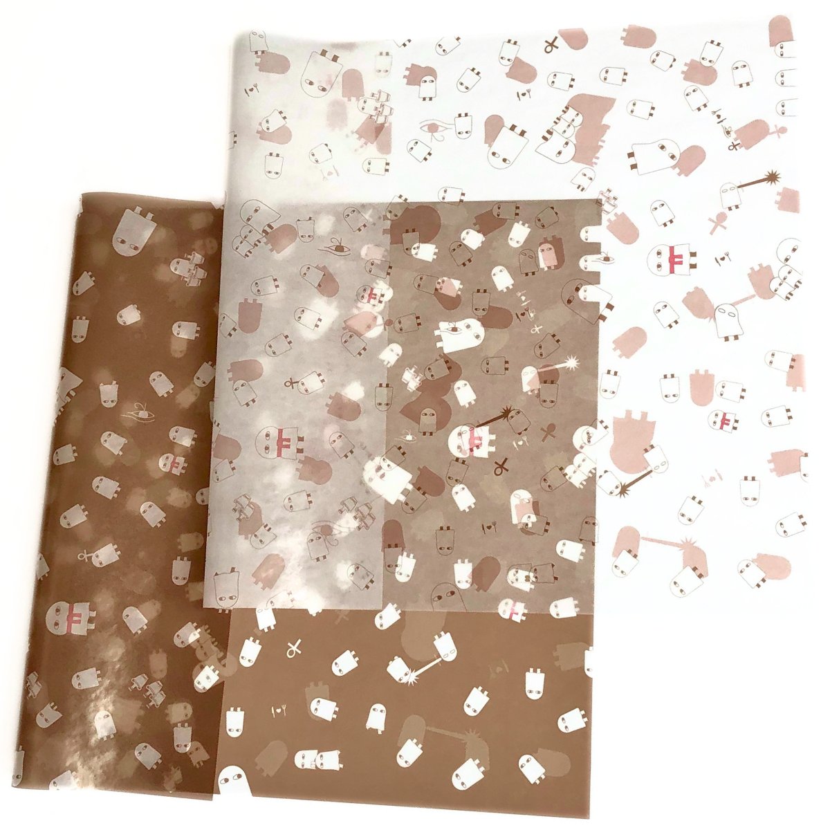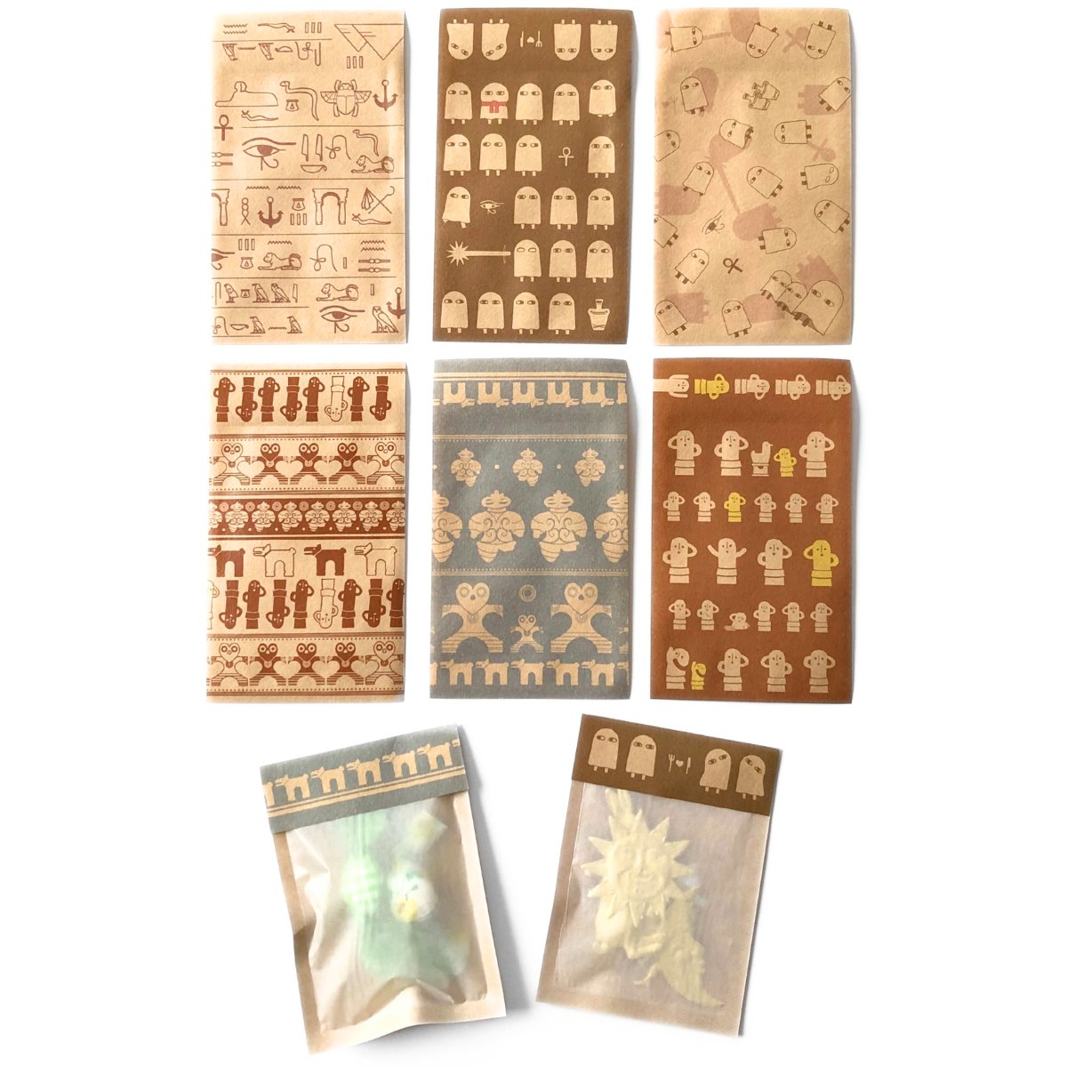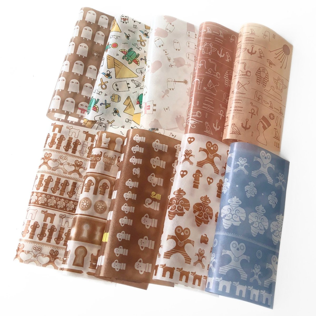 メジェド、ハニワ、土偶、古墳、エジプトなどのモチーフを集めた「メジェド&歴史柄コーナー」をブース内に設けます。グラシン紙を使用した、封筒、ペーパーリボン、包装紙、デザインペーパーなどのペーパーアイテムを販売します。