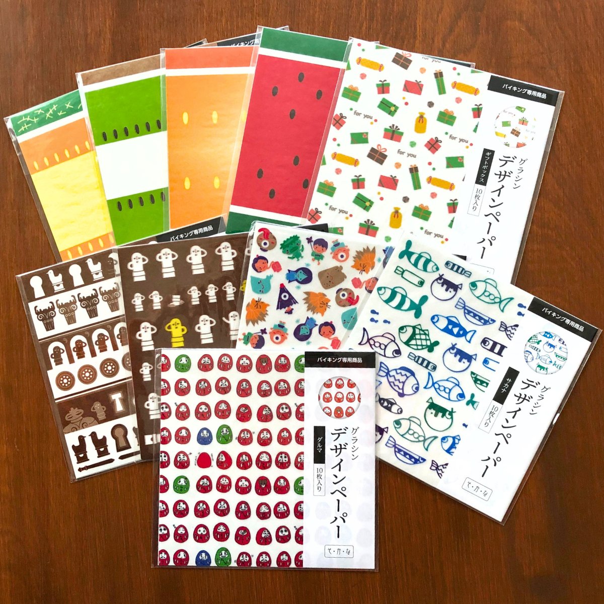 バイキング形式でお客様が自由に選ぶグラシンデザインペーパーバイキングは、1個(10枚入り)198円で、お好きな柄をお好きな個数選んでいただけます。デザインは繊細で美しい夜空、愛らしい動植物、スイーツにフルーツと幅広く、今回は妖怪、ダルマが仲間入りしました。コラージュやペーパークラフトにぴったりです。自分だけのオリジナル作品を楽しんでください。