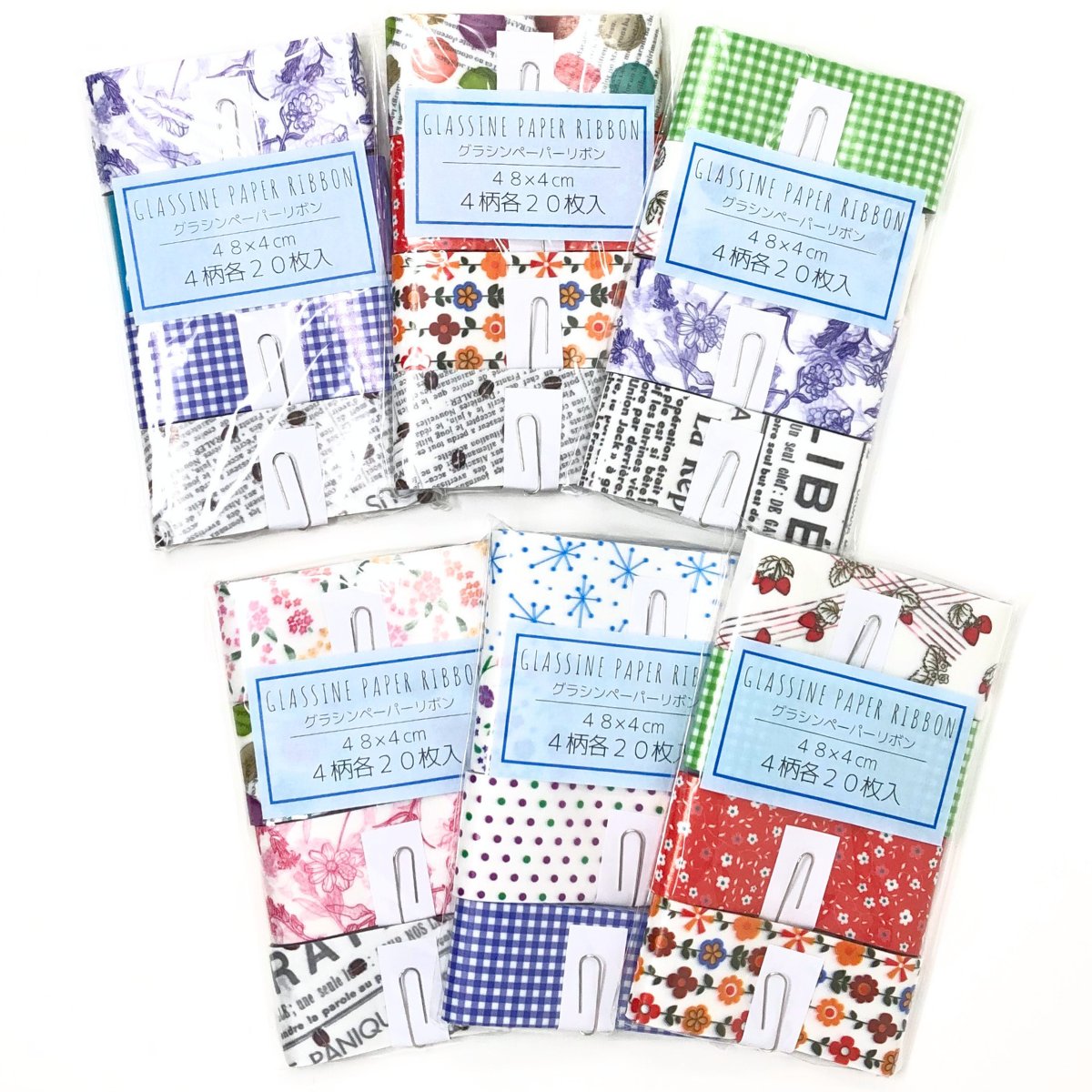 文具女子博in大阪2025で販売するグラシンペーパーリボンは、幅4cm、長さ48cmのサイズでいろいろな柄がランダムで4柄入ったセットです。一巻に20枚入りでたっぷり楽しめます。