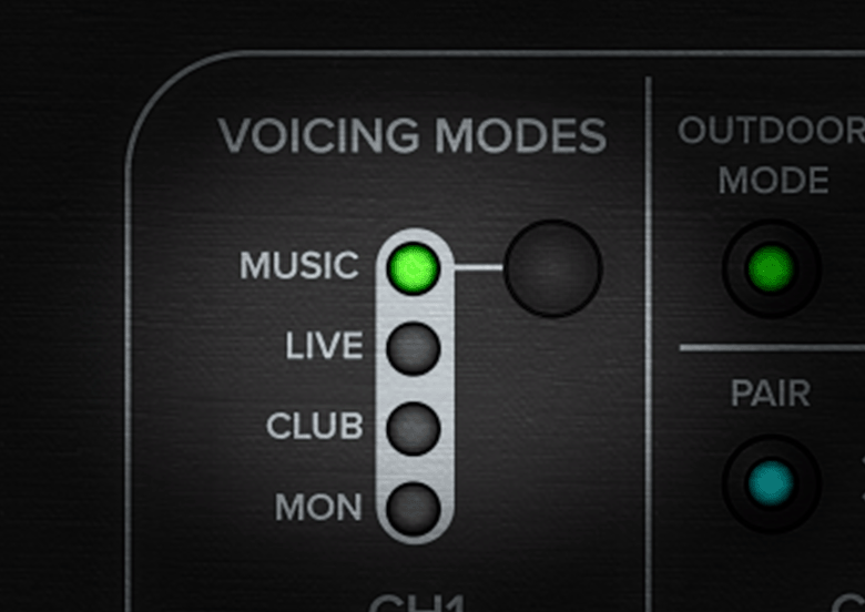 Thump XTシリーズには用途や設置場所に合わせ選択可能な4種類のボイシングモードを装備しました。CDやミュージックプレーヤーなどの音楽再生音源に最適なMUSICモード、ライブ演奏に最適なLIVEモード、低域を拡張しDJイベントなどに最適なCLUBモード、ハウリングを抑えるチューニングを施しフロアモニター設置時やサイドフィル設置時に最適なMONITORモードと誰でも瞬時にボタン一つで最適なサウンドを演出することができます。