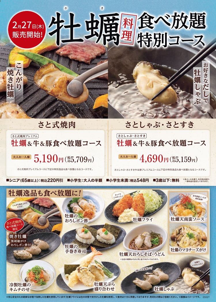 国内197店舗を展開する「和食さと」では、人気の3種類の食べ放題「しゃぶしゃぶ食べ放題:さとしゃぶ」、「すき焼き食べ放題:さとすき」、そして「焼肉食べ放題:さと式焼肉」に、期間限定で『牡蠣料理』が食べ放題の新コースが登場しました!!!今回期間限定で販売する牡蠣料理食べ放題コースでは、浜蒸し牡蠣をお好きな鍋出汁でしゃぶしゃぶとしてお召し上がりいただける「牡蠣しゃぶ」をはじめ、牡蠣のまろやかさと海苔の風味の相性良い「牡蠣の手巻き寿司」、サクサクでジューシーな「牡蠣フライ」、さっぱりとおろしポン酢で仕上げた「牡蠣のおろしポン酢」など牡蠣の美味しい料理をご用意しました!!そしてさと式焼肉ご注文の方限定で、焼きたての香ばしい牡蠣を楽しめる「焼き牡蠣」も食べ放題♪ポン酢はもちろん、「おろしにんにく」をつけて焼くのもおすすめです。牡蠣がお好きな方必見!!和食さとの「牡蠣料理食べ放題コース」を是非この機会にお楽しみください。