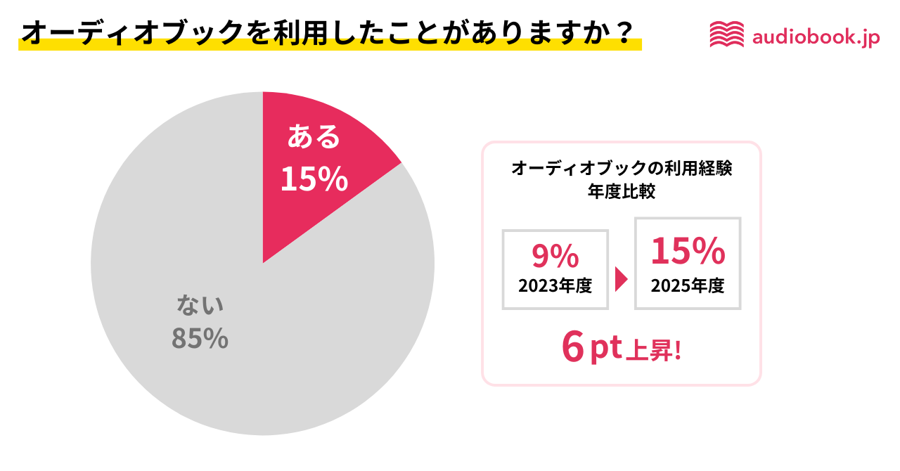 また、「これまでにオーディオブックを利用したことがありますか?」という問いには「ある」が15%。2023年の調査結果9%よりも6ポイント上昇し、利用経験者は2年で6割増加しました。