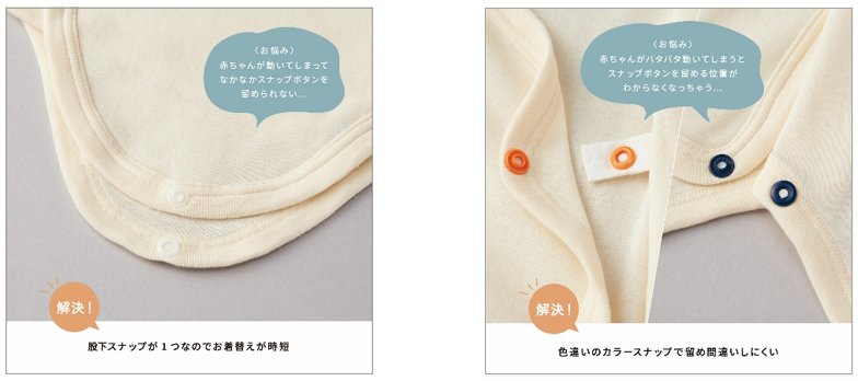従来品では2つあった股下スナップボタンを1つにし、胸元のスナップボタンも数を減らしカラーを分けてわかりやすくしました。