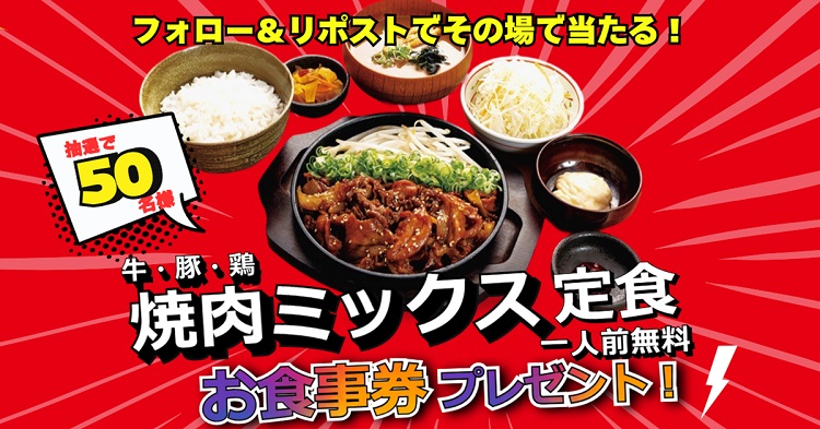 「【牛・豚・鶏】焼肉ミックス定食1人前のデジタルお食事券」を抽選で50名様にプレゼント。