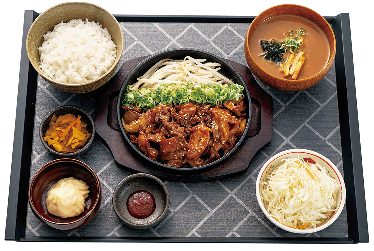 焼肉は、牛バラ・豚バラ・鶏モモの3種類のお肉を使用し、ニンニクと豆板醤でコクと風味を出し、玉ねぎの甘味を効かせた特製ダレに店内で漬け込んでから焼き上げるボリューム満点の定食です。定食のごはんは、おかわり無料です。