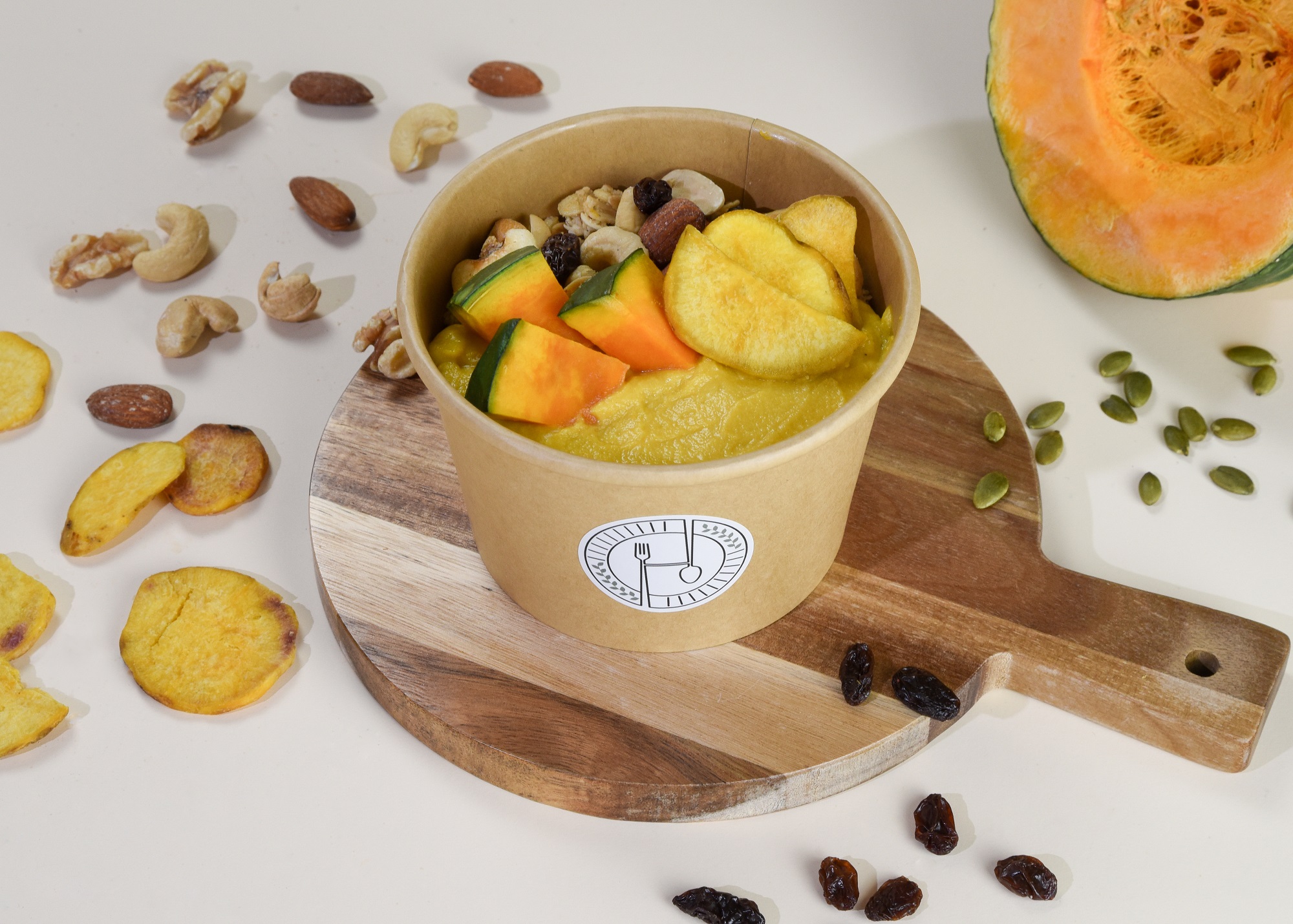 かぼちゃ豆腐クリームをベースに、シナモン・ナッツ・グラノーラ・レーズン・サツマイモチップス・バナナが絶妙にマッチ!秋冬だけじゃなく、1年中食べたい優しい甘さです。