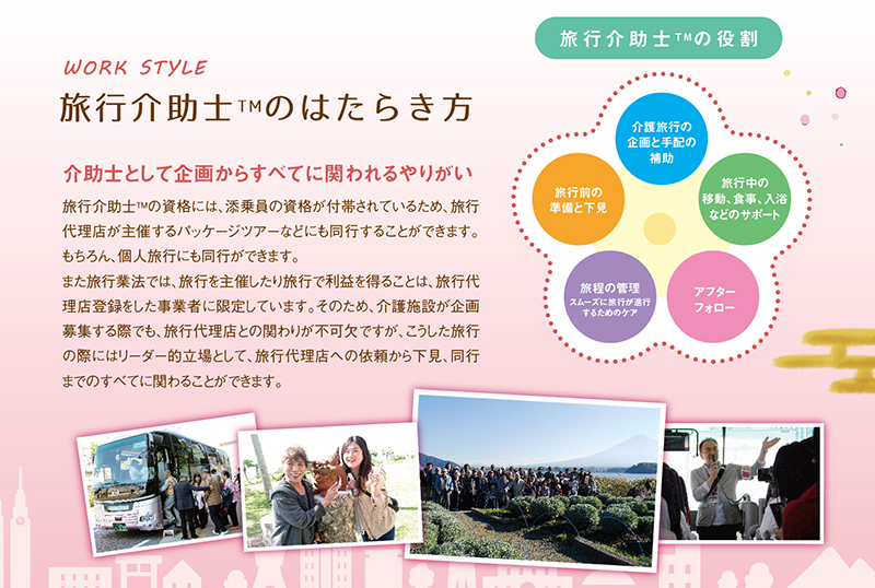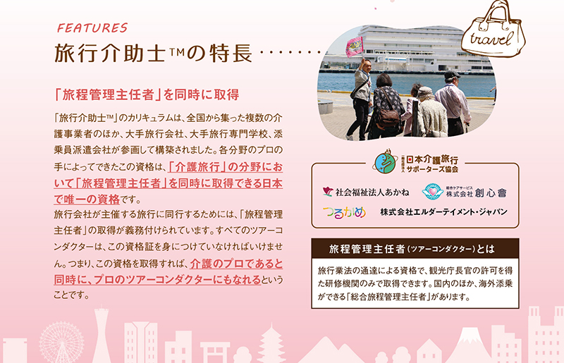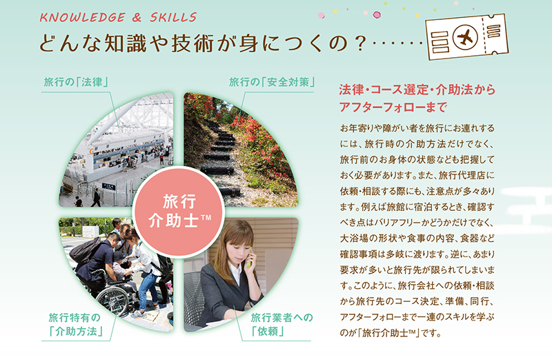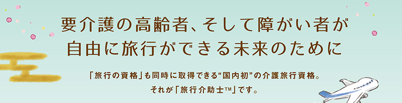 「旅行に行きたい!」を叶える!要介護の高齢者、そして障がい者が自由に旅行ができる未来のためにお手伝いする資格。お年寄りや障がいを持った方から「また旅行に行きたい」「あのときは、楽しかった」という声をたくさん耳にします。皆さん、もう一度旅行ができるようになりたいのです。そんな想いをサポートするのが「旅行介助士TM」です。旅行前の準備、旅行中の介助法から観光の知識まで、幅広いスキルを習得して、たくさんの方の「旅行したい」という夢のサポートをしましょう。「旅行の資格」も同時に取得できる“国内初”の介護旅行資格。それが「旅行介助士TM」です。
