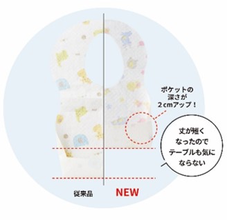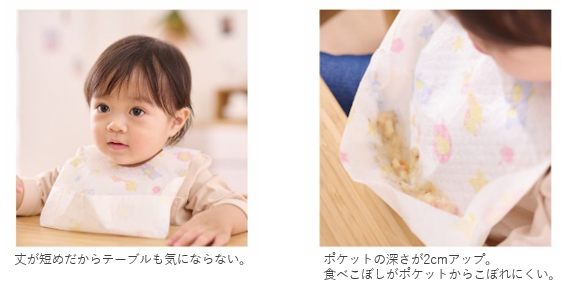 従来品より丈を短くし、エプロンがテーブルに当たるなどの困りごとを解決。また、ポケットを深くしたことで食べこぼしをしっかりキャッチし、お子さまの快適なおしょくじをサポートします。