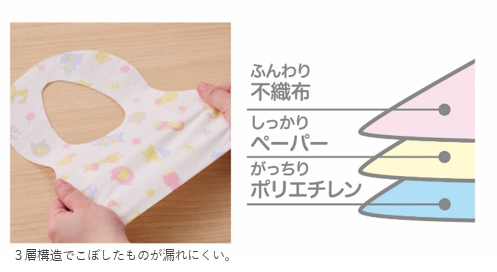 また、3層構造なので丈夫でやぶれにくく、液状のものでも内側にしみ出しにくいので服の汚れや濡れを気にせずおしょくじができます。