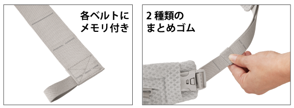ヘッド&ネックサポートを留めるボタンやウエストベルトのバックル、シートアジャスタースライダーが隠れるデザインに。また、各ベルトにはメモリが入り、着用する方の調節がラクに行えるようになりました。