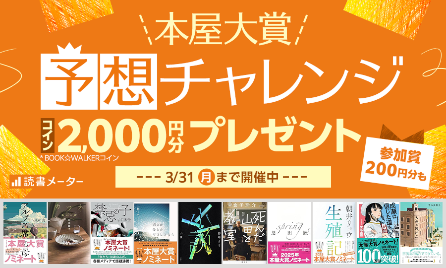 株式会社ブックウォーカー(本社:東京都千代田区 代表取締役社長:森田岳)は、同社が運営する国内最大級の本のレビュー投稿サイト「読書メーター」にて、ユーザー投票による「本屋大賞2025 予想チャレンジ」企画を3月10日(月)から開催します。 2月3日(月)に発表された「本屋大賞2025」のノミネート作品の中から大賞受賞作品を予想し、3月31日(月)まで読書メーター内特設ページで投票を募集します。予想が的中し、投票した作品が大賞となった方には「的中賞」として2,000円分のコインをプレゼントします。また、投票した方全員に200円分のコインを「参加賞」として配布します。