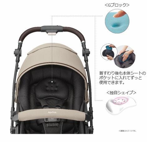 衝撃吸収材の「Gブロック」内蔵で、赤ちゃんの頭部に伝わる衝撃を吸収します。