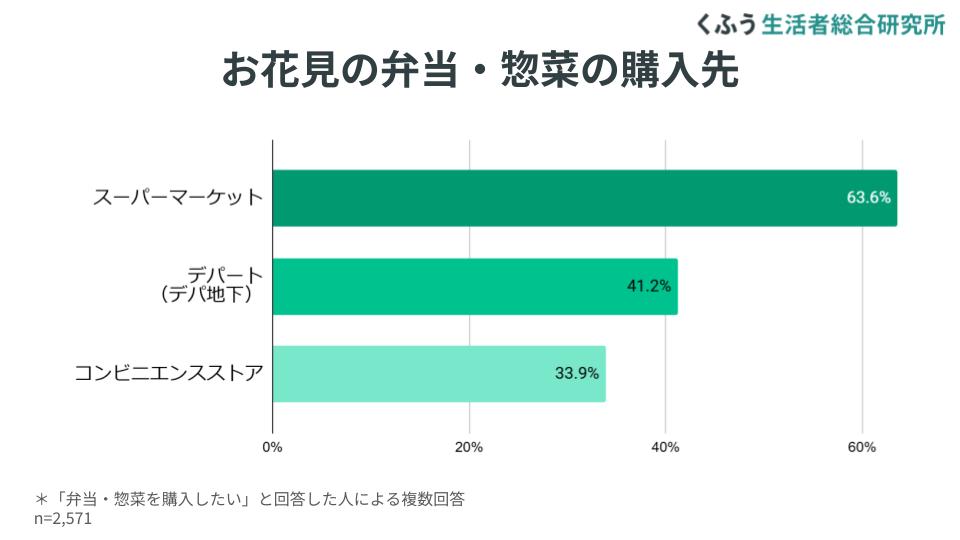 お花見の際に「購入した弁当・惣菜を食べたい」と回答した人に購入先を聞いたところ、「スーパーマーケット」(63.6%)が最も多く、デパート(41.2%)、コンビニエンスストア(33.9%)が続きました。